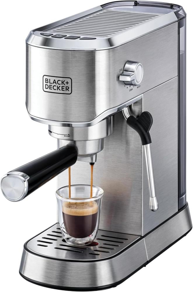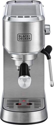 ماكينة Black+Decker ECM150-B5 محضّر إسبريسو يدوي بتصميم أنيق باللون الفضي، مزودة بمحرك قوي بقدرة 1450 واط ونظام ضغط 15 بار يؤمن قهوة بنكهة غنية ورغوة كريمية. مزودة بخاصية تبخير الحليب (Cappuccino) والتحكم الحر في التحضير، لتقديم لاتيه ماكياتو وأمريكانو بسهولة.