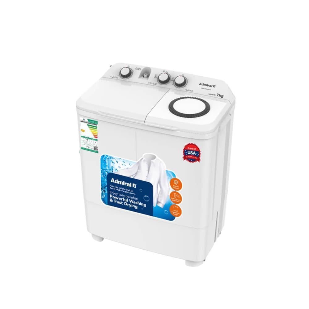 غسالة ملابس ادميرال 7 كيلو بحوضين سعة 7 كجم مع مقبض للتحكم في غطاء دوران مدخل الهواء وخزانة مقاومة للصدأ, لون أبيض صنع في الصين ADTT7KUWCQ