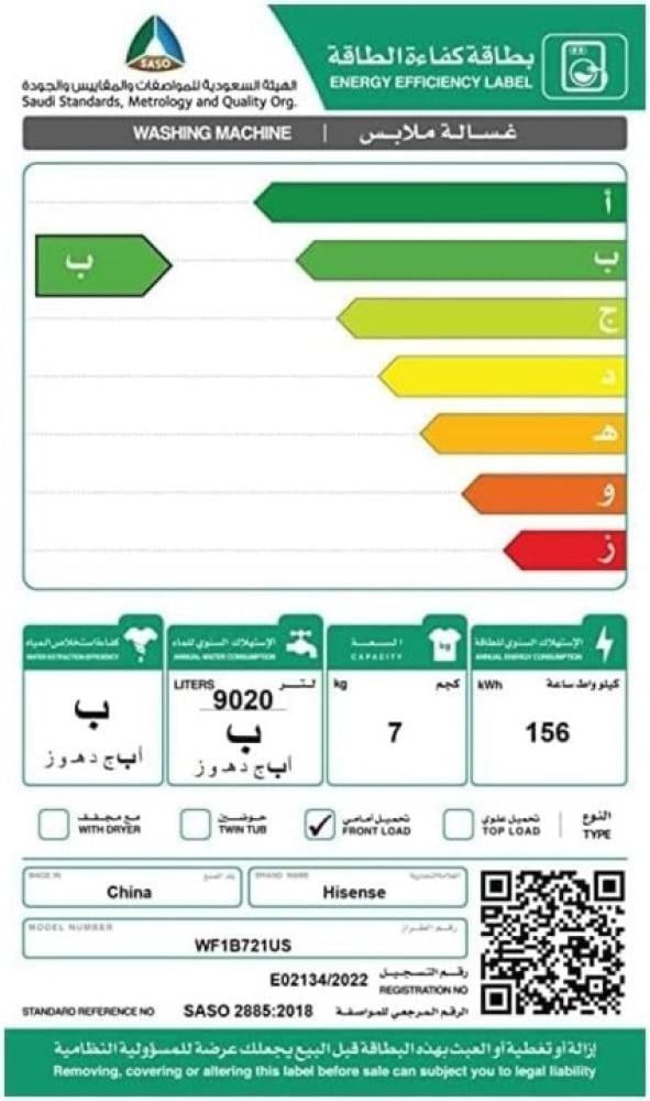 Hisense Washing Machine 7 Kg Front Load Made in China Silver Energy Efficiency with WF1B721US