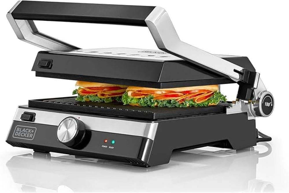 The Black+Decker CG2000-B5 grill features a 180° opening design and covers an area of 1500 cm², ideal for families. It uses 2000 watts of power for su...
